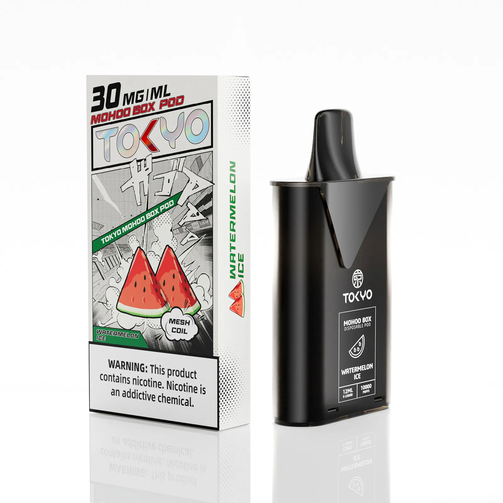 東京魔盒電子煙煙彈採用植物甘油與丙二醇基底,搭配高純度尼古丁鹽,容量 12 mL、尼古丁強度 30 mg/mL(3%),搭載 1.0Ω 鋼網棉霧化芯,設計為一次性 pod,約 10,000 口,吸引力持久。