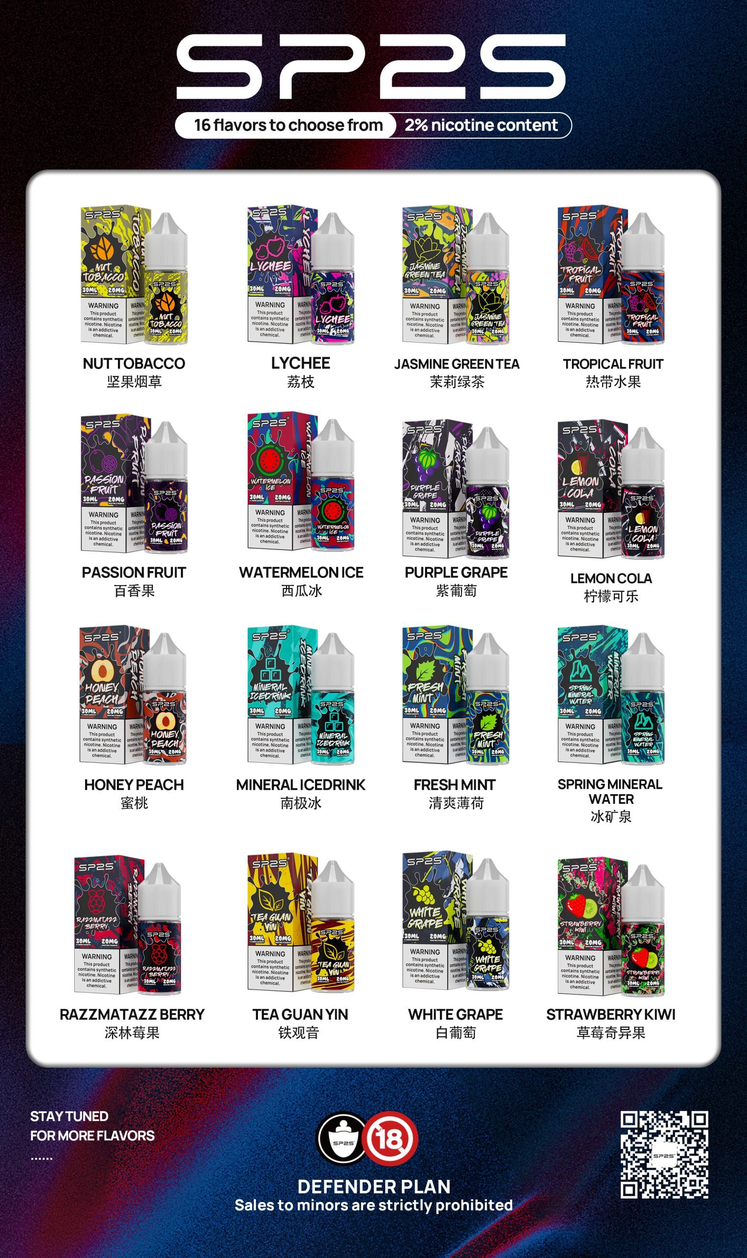 冰礦泉, 南極冰, 堅果煙草, 檸檬可樂, 深林莓果, 清爽薄荷, 熱帶水果, 白葡萄, 百香果, 紫葡萄, 茉莉綠茶, 草莓奇異果, 荔枝, 蜜桃, 西瓜冰, 鐵觀音